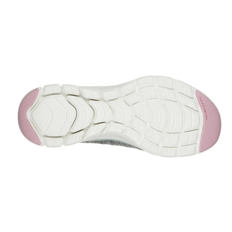 Compra en Decathlon Zapatillas Caminar Mujer SKECHERS Flex Appeal 4.0 Gris Con un diseño exterior textil de la mejor calidad, estas zapatillas cuentan con una plantilla de Memory Foam acolchada y amoldable al pie, buena sujeción en el empeine y suela de goma antideslizante.