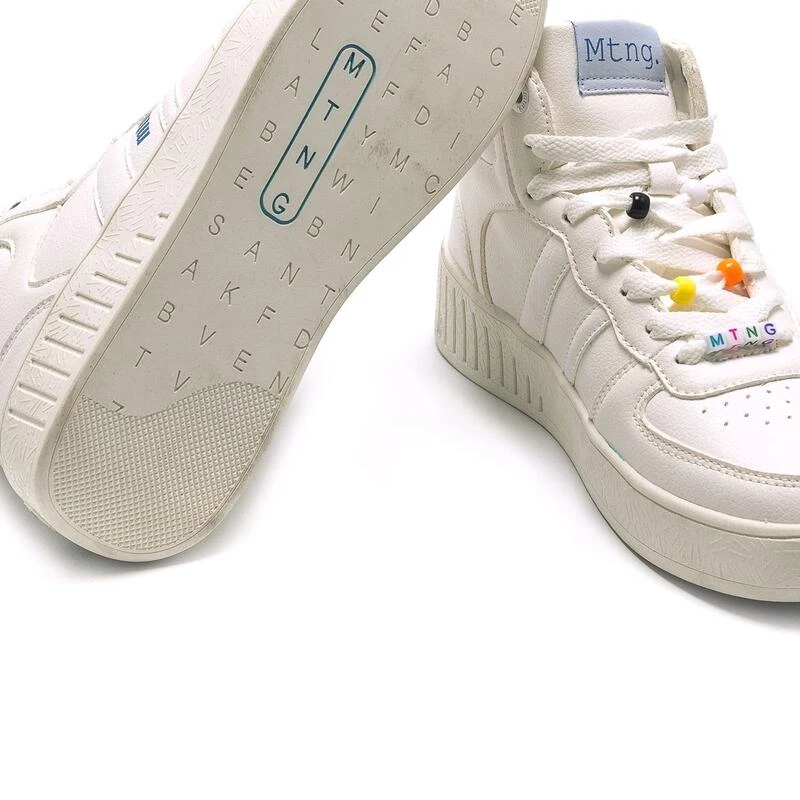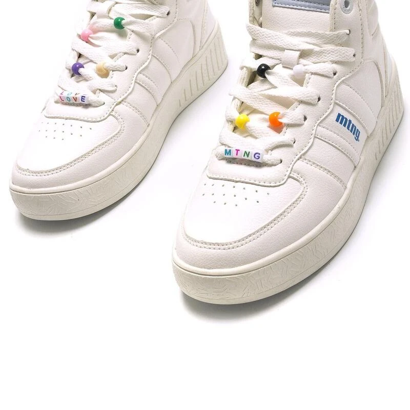 Compra en Decathlon Zapatillas de caminar para mujer mtng delta en color blanco Deportiva Delta abotinada para mujer de color blanco con planta foam, logo de la marca en el lateral de color azul y cierre de cordones planos con abalorios de colores y frases. Un modelo con detalle.